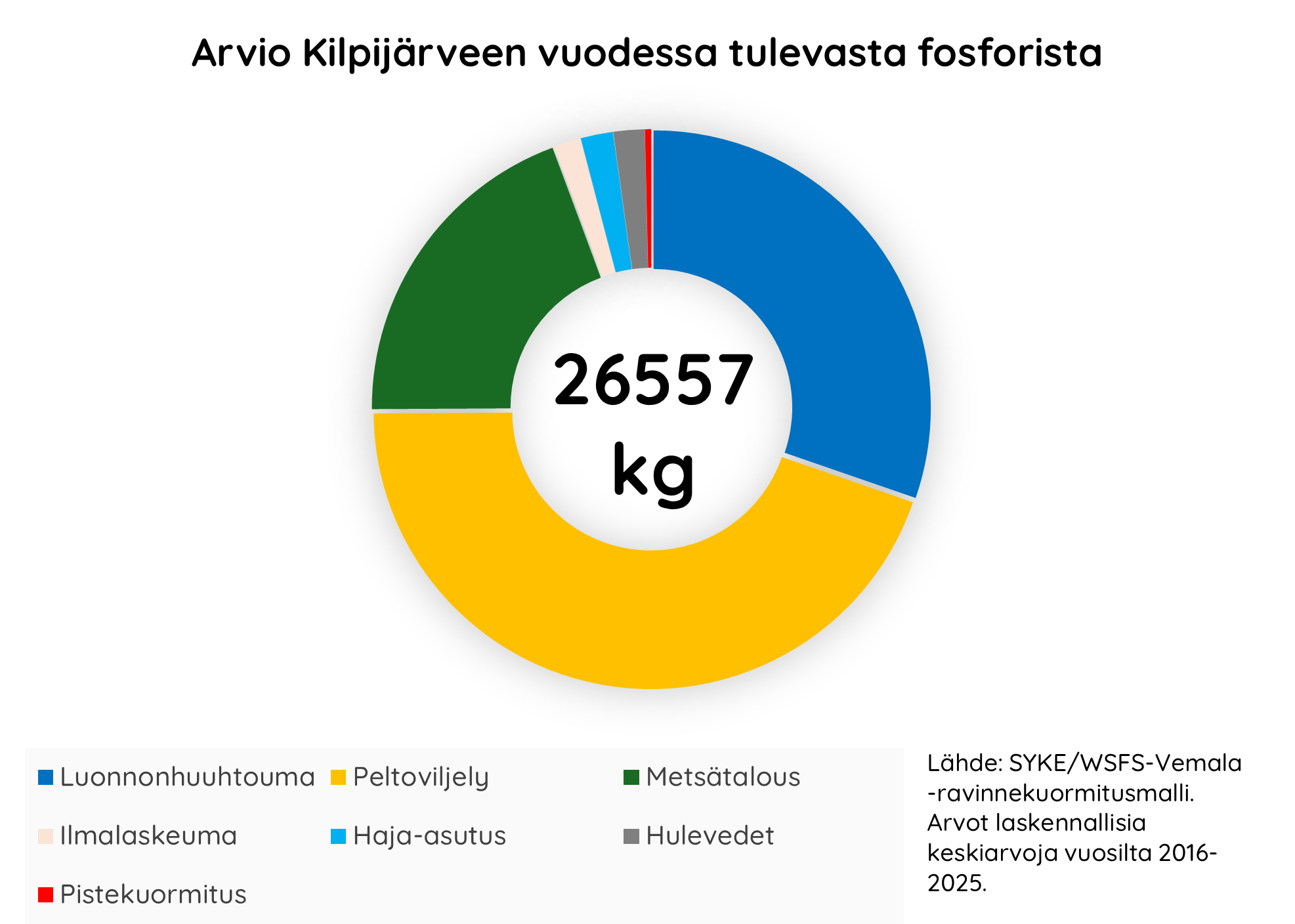 Kilpijärvellä on laaja yläpuolinen valuma-alue, jolla harjoitettava ihmisperäinen toiminta vaikuttaa järven tilaan. Suurimmat osuudet järveen tulevasta fosforista ovat peräisin peltoviljelystä ja metsätaloudesta.