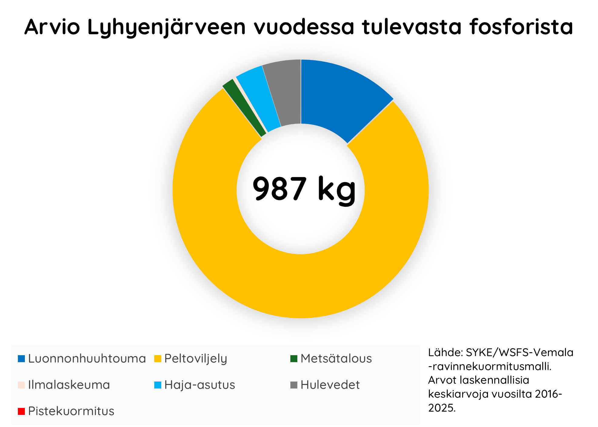 Yli kaksi kolmasosaa Lyhyenjärveen tulevasta fosforista on peräisin maataloudesta. Pohjois-Savon vesienhoidon toimenpideohjelmassa (2022-2027) esitetty ulkoisen fosforikuormituksen vähentämisen tarve on 47 %.