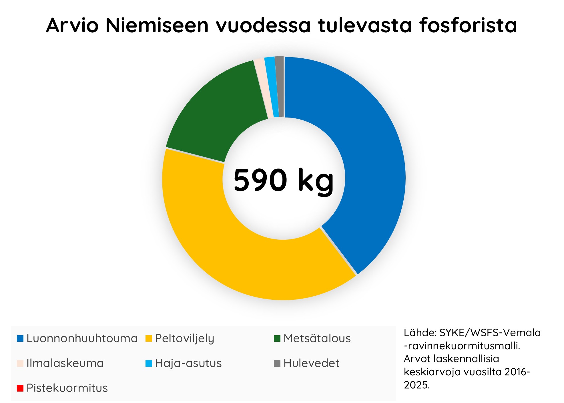 Noin 60 % Niemiseen tulevasta fosforista on peräisin ihmisperäisestä toiminnasta. Peltoviljelystä peräisin oleva osuus tulevan fosforin määrästä on n. 40 %. Pohjois-Savon vesienhoidon toimenpideohjelmassa (2022-2027) esitetty ulkoisen fosforikuormituksen vähentämisen tarve on 34 %.
